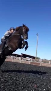 Am Sonntagvormittag durften wir auf dem neuen Platz mit dem schwarzen Häckselboden reiten, auf den alle so furchtbar neugierig waren. Dass er sehr stark federte, hatten wir schon am Tag zuvor durch Hüpfübungen herausgefunden. Auch hier haben wir uns wieder der Durchlässigkeit gewidmet und an Übungen wie der Schrittpirouette gearbeitet. Die Einheit haben wir genutzt, um Pferde und Reiter auf das Training am Nachmittag auf der Ovalbahn vorzubereiten.