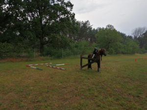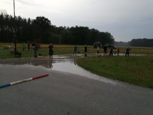 Starkregen begleitete dabei die Dressur in der Halle. Pünktlich zum Trail aber wurde es wieder trocken. Und während dieser lief, befreiten die vielen fleißigen Helfer in Birkholz die Ovalbahn von den Wassermassen.