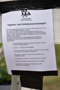 „Die größte Herausforderung war die Kürze der Zeit für Planung und Umsetzung“, sagt Anne-Sophie Fliß Sportwartin des Landesverbandes. Alle Höfe mussten zuerst eine Genehmigung vom zuständigen Gesundheitsamt für die Durchführung erhalten. Der Landesverband half bei der Erstellung der notwendigen Hygienekonzepte. Durch die Lockerungen der brandenburgischen Verordnung während der Antragsstellung, ging es mit den Genehmigungen am Ende dann schnell. Ulla Gomiß-Fliß, 1. Vorsitzende des Landesverbandes, übernahm dann für die Qualitage auf einigen Höfen die Rolle der Hygiene-Beauftragten und prüfte die Umsetzung der auferlegten Maßnahmen. So hieß es überall Abstand halten und in geschlossenen Räumen auch Maske tragen.