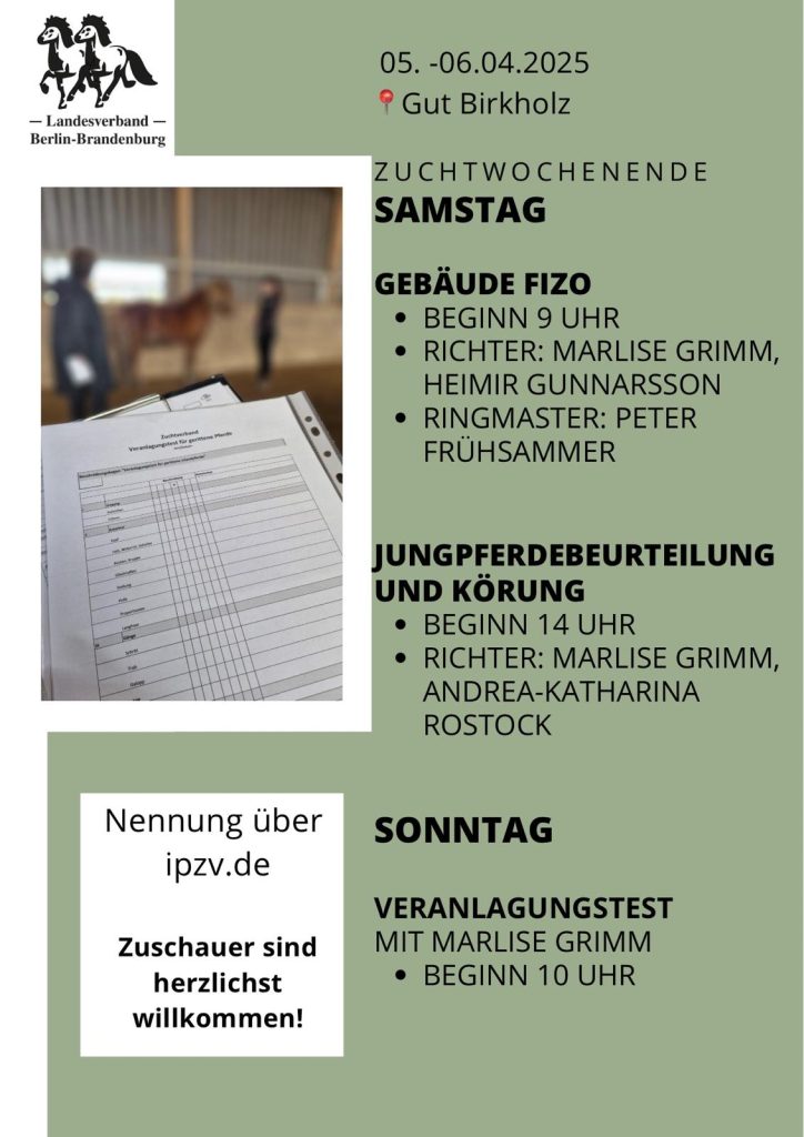 Wer schon dieses Frühjahr sein Pferd professionell eingeschätzt bekommen möchte, ist herzlich eingeladen am Zuchtwochenende 05. & 06. April auf Birkholz  dabei zu sein. Hier werden eine Gebäude FIZO, eine Jungpferdebeurteilung + Körung und ein Veranlagungstest angeboten und bieten damit ein breites Spektrum an Möglichkeiten. Auch Zuschauer ohne Pferd sind herzlich eingeladen.